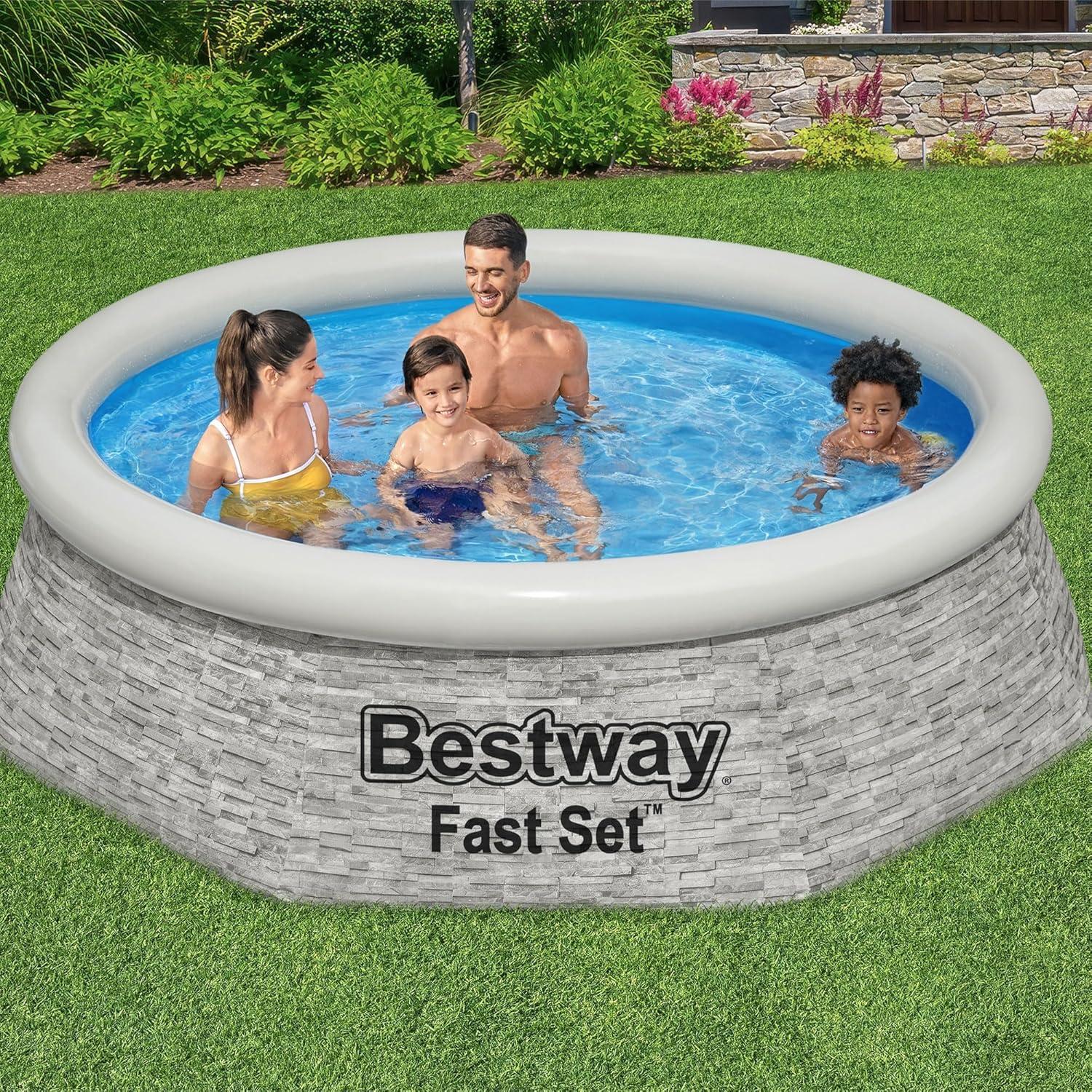 Bestway Fast Set 12′ x 30″ Round Inflatable Above Ground Swimming Pool Set, Stacked Stone Exterior Outdoor Family Pool with Filter Pump, Gray(10ft. X 26in.)