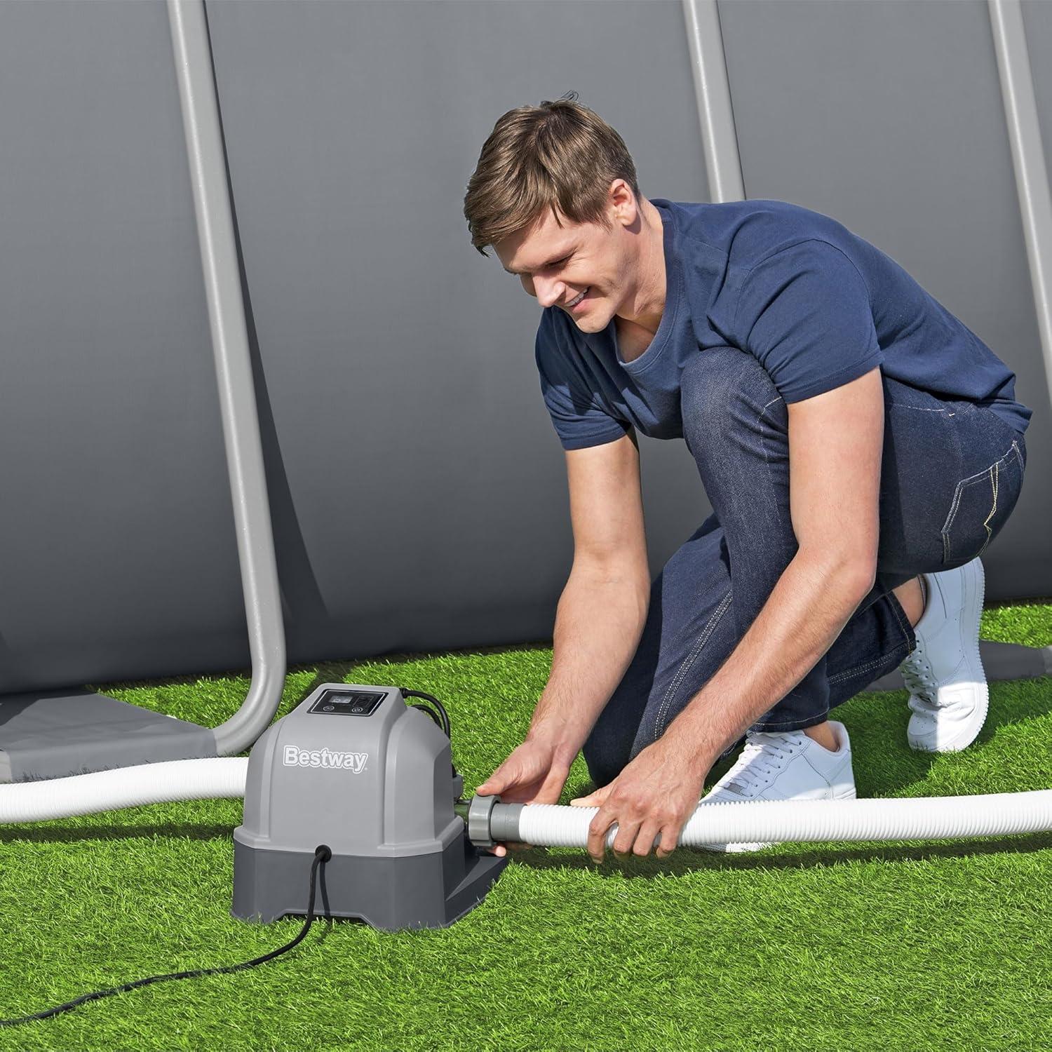 Be tough on the germs in your pool, but gentle on your skin with the innovative Flowclear™ Hydrogenic™ Saltwater Chlorinator. Using the latest technology, the Hydrogenic Saltwater Chlorinator converts salt into a small amount of bacteria-killing chlorine to keep your pool crystal clear and clean, while being gentle on your eyes, hair, skin and bathing suit. Another benefit? Without the direct addition of chlorine to your above ground pool, you'll enjoy the nearly scent-free experience of a traditional saltwater pool! Ideal for pools with water capacities up to 7,000 gal. (26,498 L) with a flow rate of at least 330 gal. (1,249 L), simply insert the salt and the system will produce 6 grams of chlorine per hour for the perfect ratio of saltwater and chlorine. Maintaining the system is a breeze, as it features an automatic self-cleaning mode. Set the timer and then go about your day! Quickly and easily control the system using the touch screen panel. Rest assured, if any issues come up, you'll be alerted by a green/red LED.