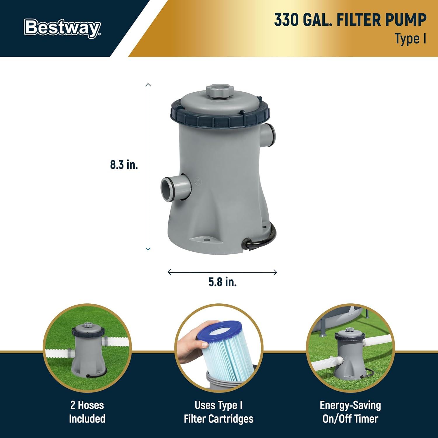 Complete above-ground pool set comes with all you need, including a 330-gallon filter pump and a repair patch kit to keep you prepared for maintenance