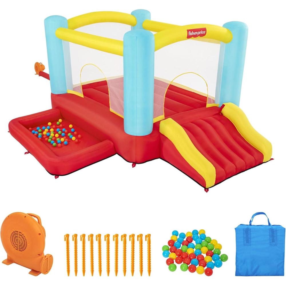Includes 110-120 volts blower to inflate the bouncer in 2 minutes or less; Comes with a repair kit with multiple assorted patches, a storage bag, 11 bouncer stakes, and 50 play balls